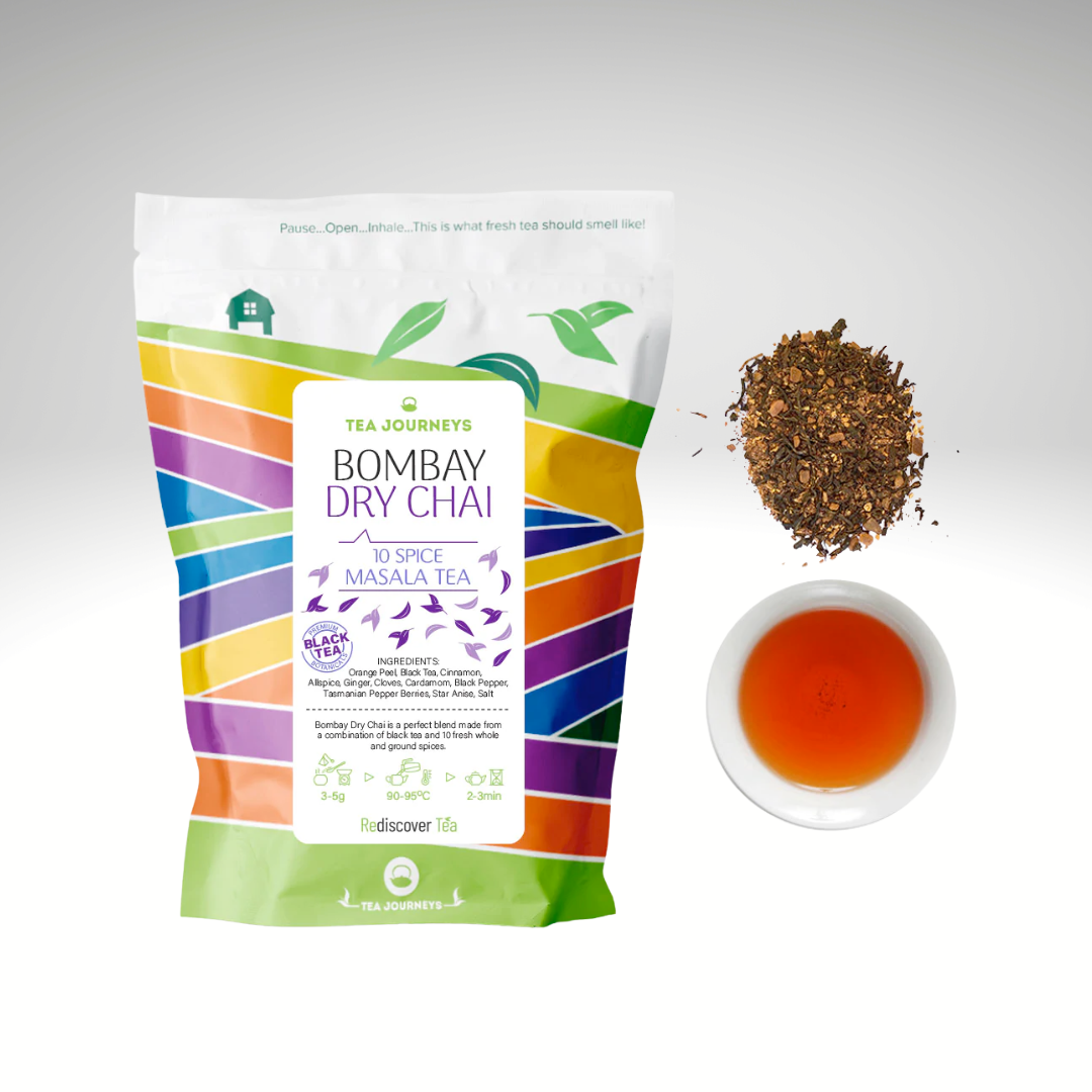 Tea Journeys, Bombay Dry Chai Tea is a perfect blend made from a combination of black tea and 11 fresh whole and ground spices.