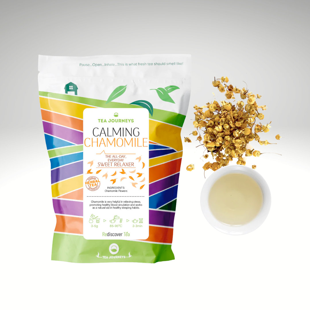 Tea Journeys, Calming Chamomile Tea is naturally sweet and made with the freshest chamomile flowers.