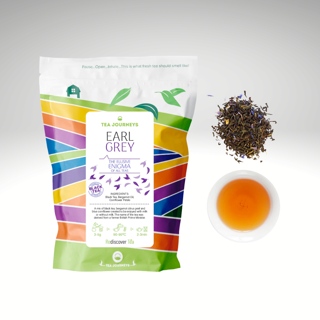 Tea Journeys, Earl Grey is a mix of black tea, bergamot citrus peel and blue cornflower created to be enjoyed with milk or without milk.
