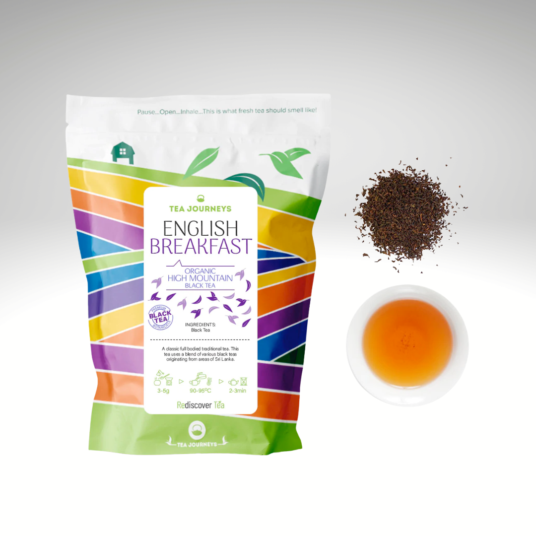 Tea Journeys, English Breakfast Tea is a classic full bodied traditional tea. This tea uses a blend of various black teas originating from areas of Sri Lanka, with tastes of light floral notes and a hint of citrus in the background.