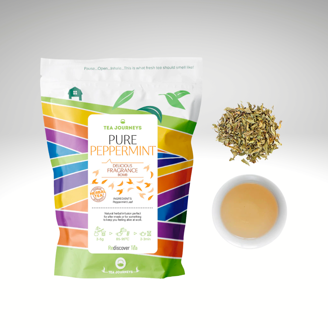 Tea Journeys, Pure Peppermint Tea is an invigorating herbal infusion with refreshing menthol notes and a long refreshing finish.